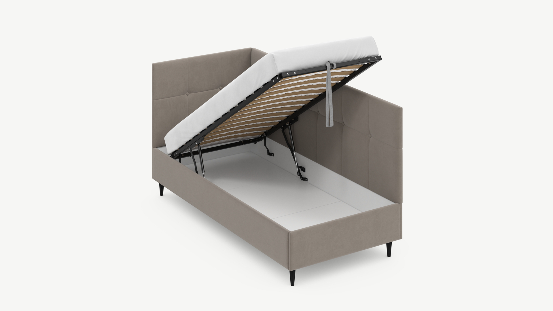 • Скрытая под основанием вместительная емкость без внутренних перегородок позволяет использовать всю площадь подкроватного пространства для хранения вещей.