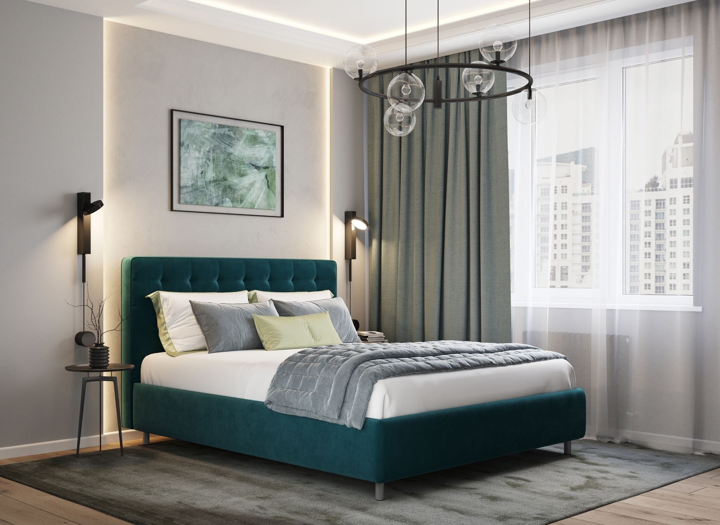 Оформите образ кровати, выбирая обивочный материал, который подчеркнет звучание Вашей спальни и отразит Ваш вкус. Обратите внимание на однотонный гладкий велюр, который усиливает объемную фактуру стежки.